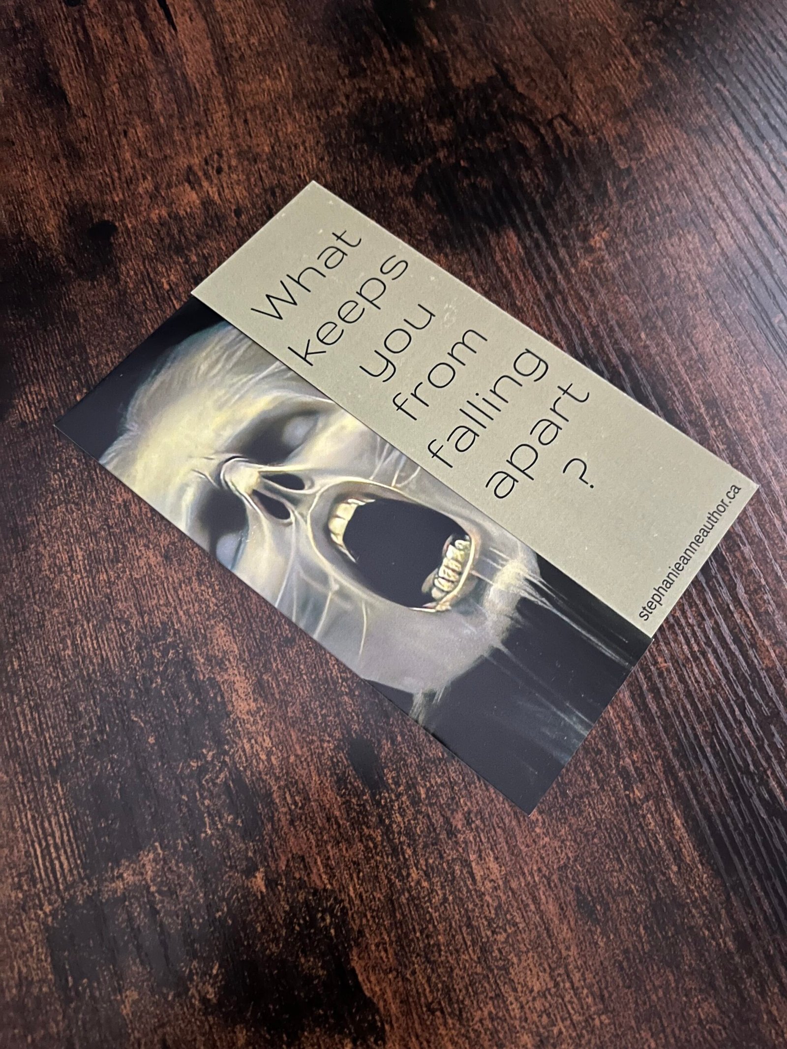 Premium Cardstock bookmark featuring cover art from Falling Apart and words on the other side: “What keeps you from falling apart?”